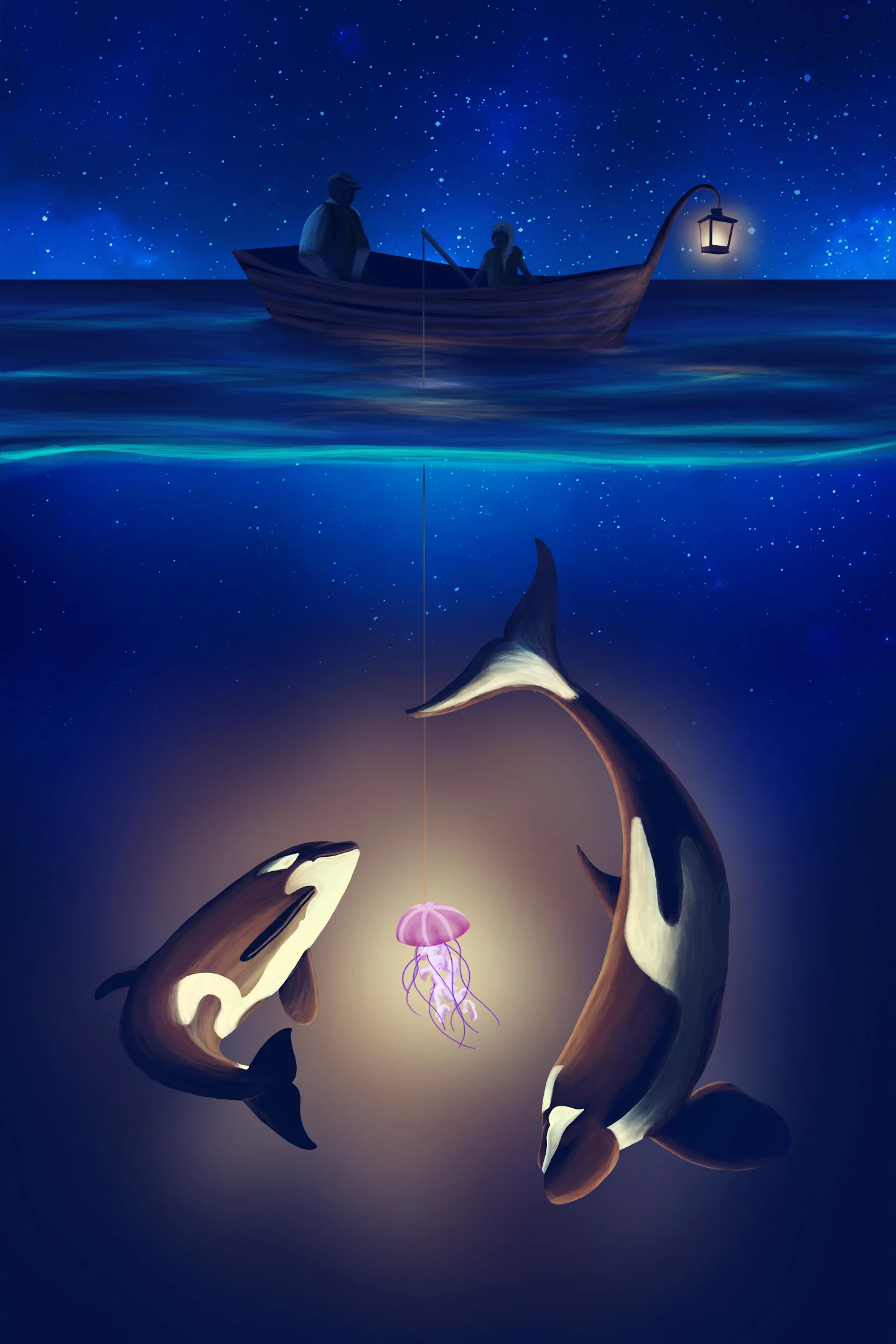 Immersed is a story about a young girl and her father going on an epic adventure by traveling the seven seas to find their way back home after a shipwreck. On this journey, the father and daughter come across a pair of killer whales by the lure of their jellyfish. This illustration was made, for the most part, for my passion for killer whales. I have drawn and taken photos of these magnificent creatures since a very young age, making this animal the reason I fell in love with art and design. The following quote, by Kenneth Brower, exemplifies the reason for my passion for killer whales: “For me, killer whales...seem to shout design louder than terrestrial creatures can murmur it. [He is] all about form and function. His markings are as lovely as any in the animal kingdom. The ovoid of his white eye patch and the lobes of his white, tripartite belly patch make a beautiful geometry. His flukes are the finest sculpture in nature...The killer whale represents a pinnacle of evolution.” I enjoy capturing the emotion and personalities of these animals in my photography and illustrative work.